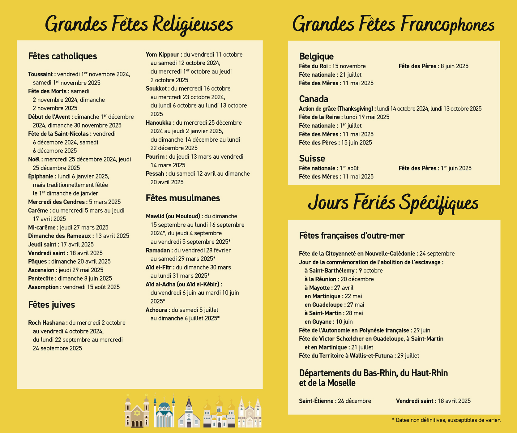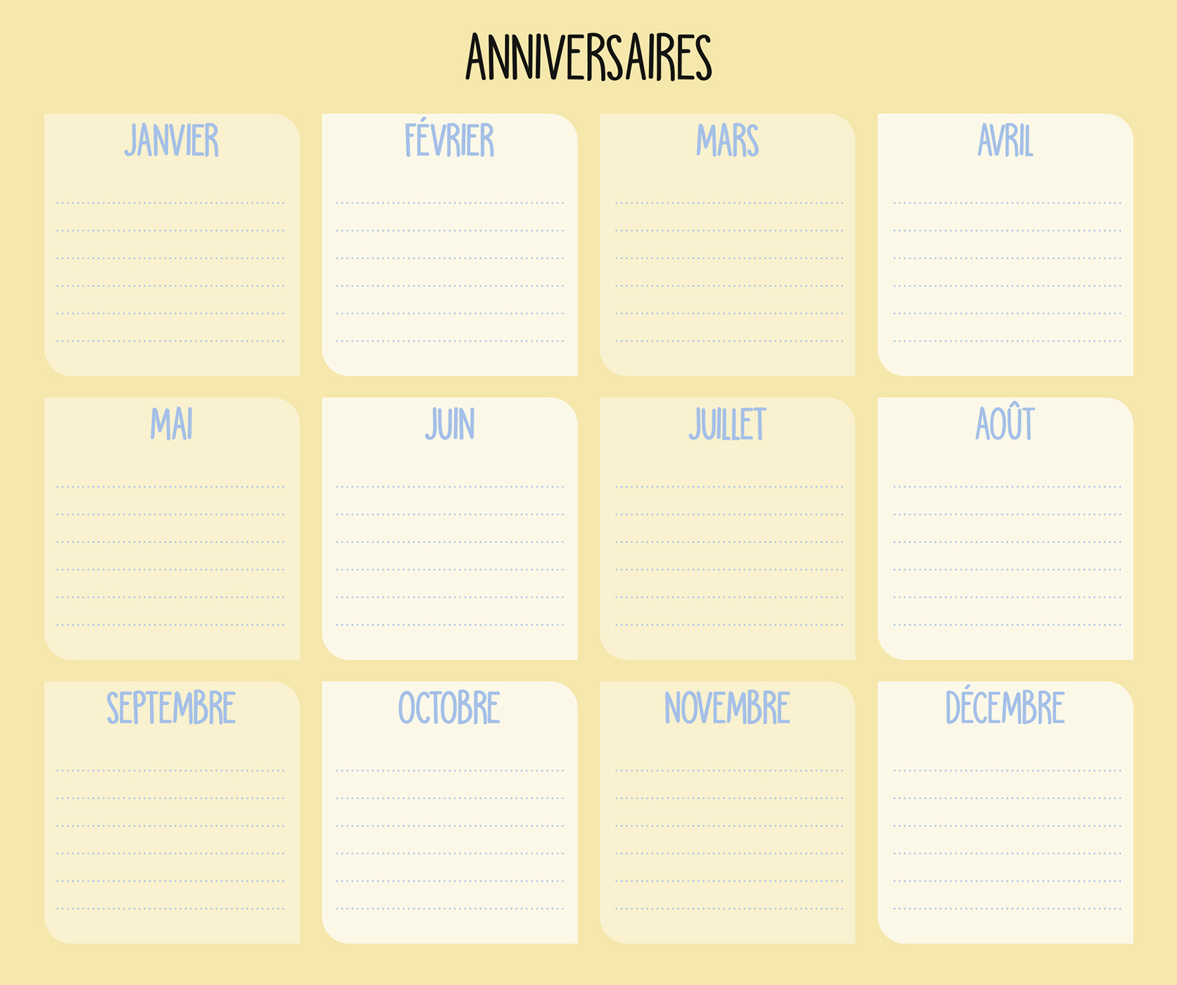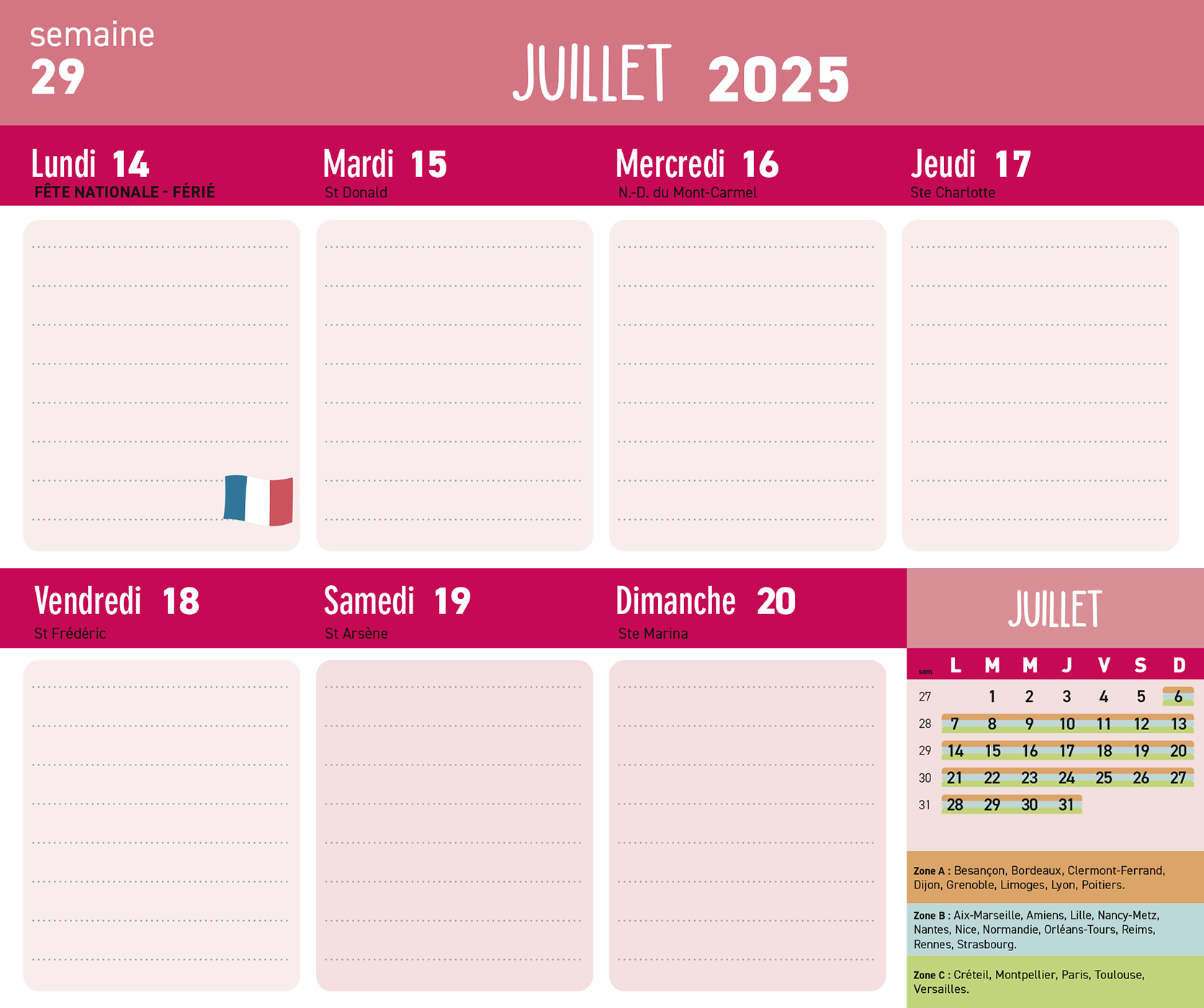 – 1 page d'organisation par semaine (grandes cases pour tout noter), avec les dates officielles des vacances scolaires