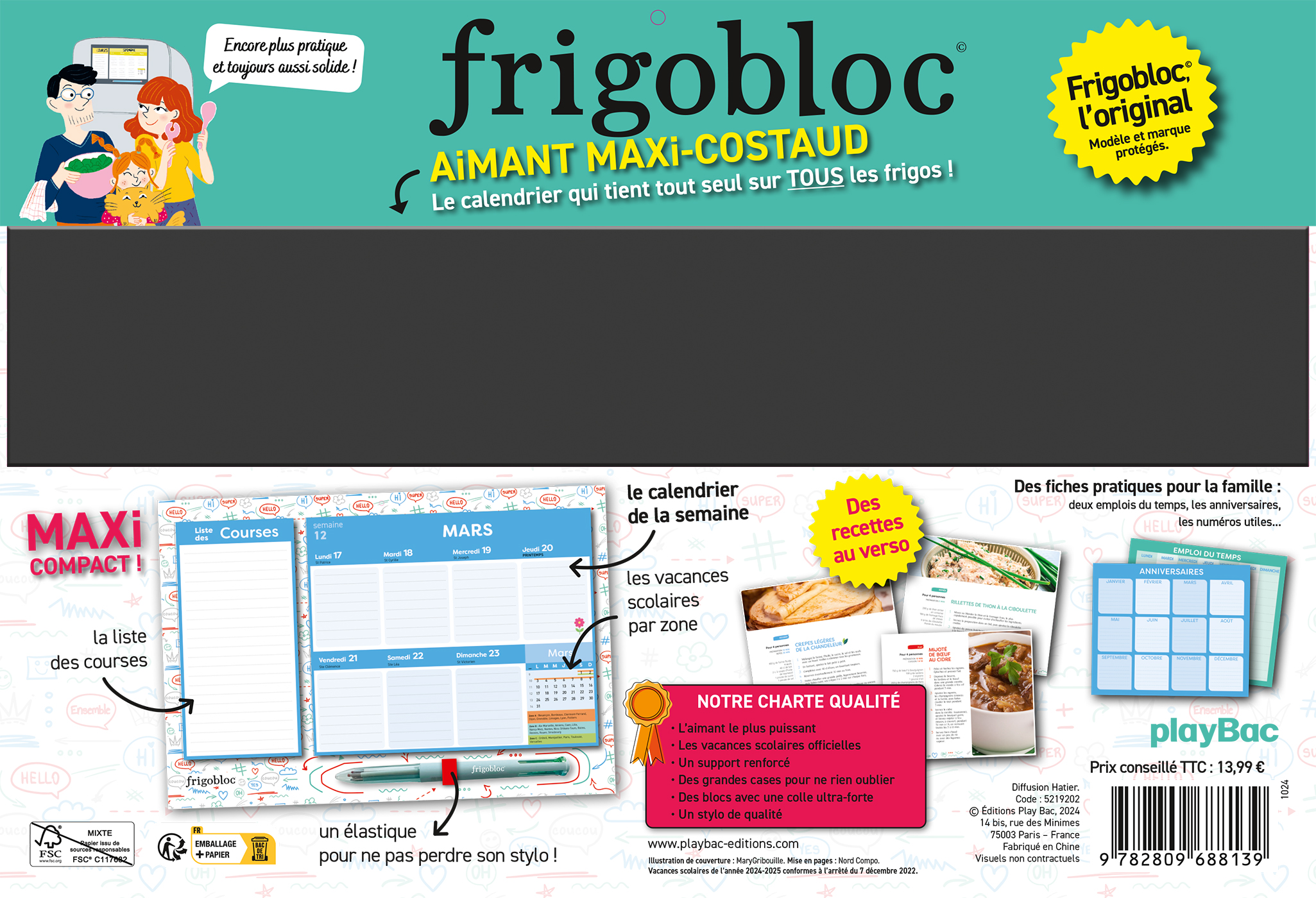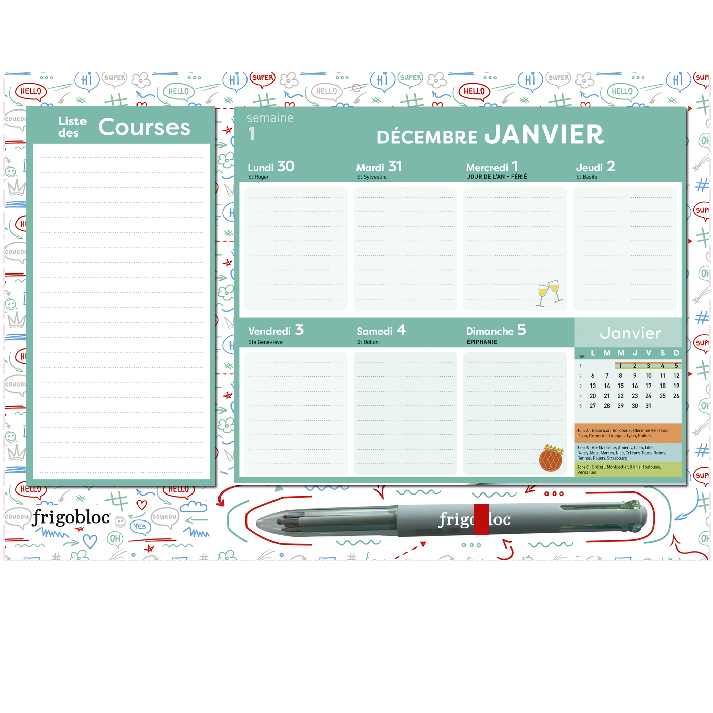 FRIGOBLOC©, LE VRAI, L’ORIGINAL ! La marque N°1 des calendriers familiaux vous présente son FrigoBloc en version mini et avec un stylo 4 couleurs : chaque membre de la famille a la sienne pour noter son programme ! Avec ce calendrier maxi-aimanté qui tient parfaitement sur TOUS les frigos (même bombés), planifiez tout de janvier à décembre 2025.