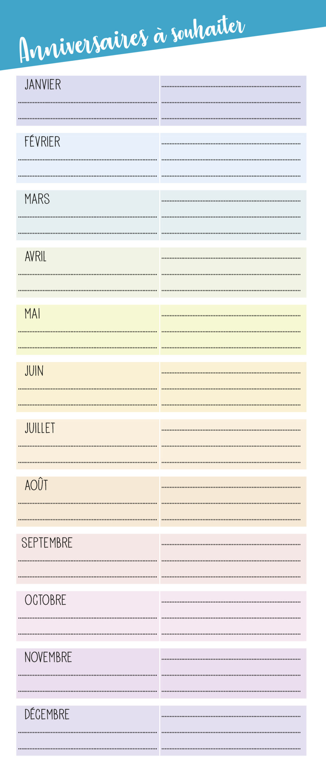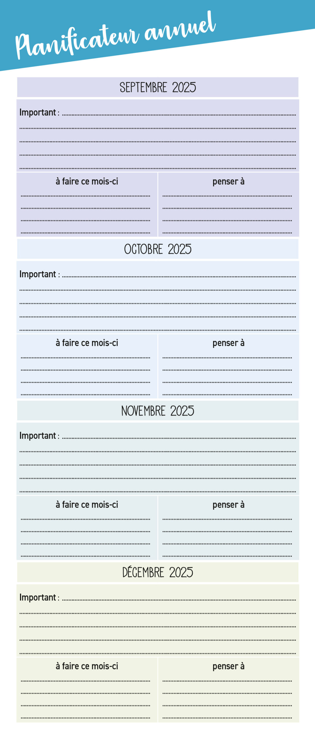 – 1 planning d'organisation par mois avec les dates officielles des vacances scolaires