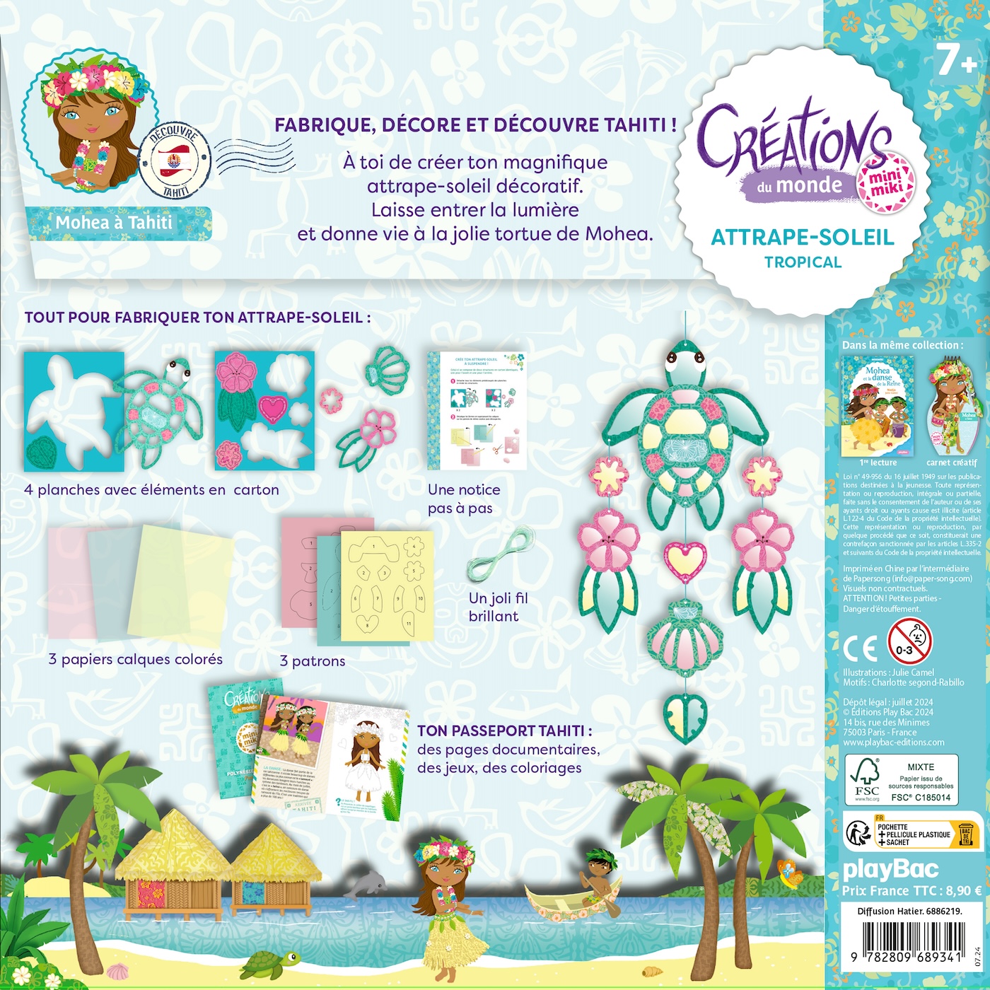 Dans cette pochette, une notice en pas à pas et tout le matériel nécessaire pour créer un magnifique attrape-soleil décoratif, et donner vie à la jolie tortue de Mohea la tahitienne.