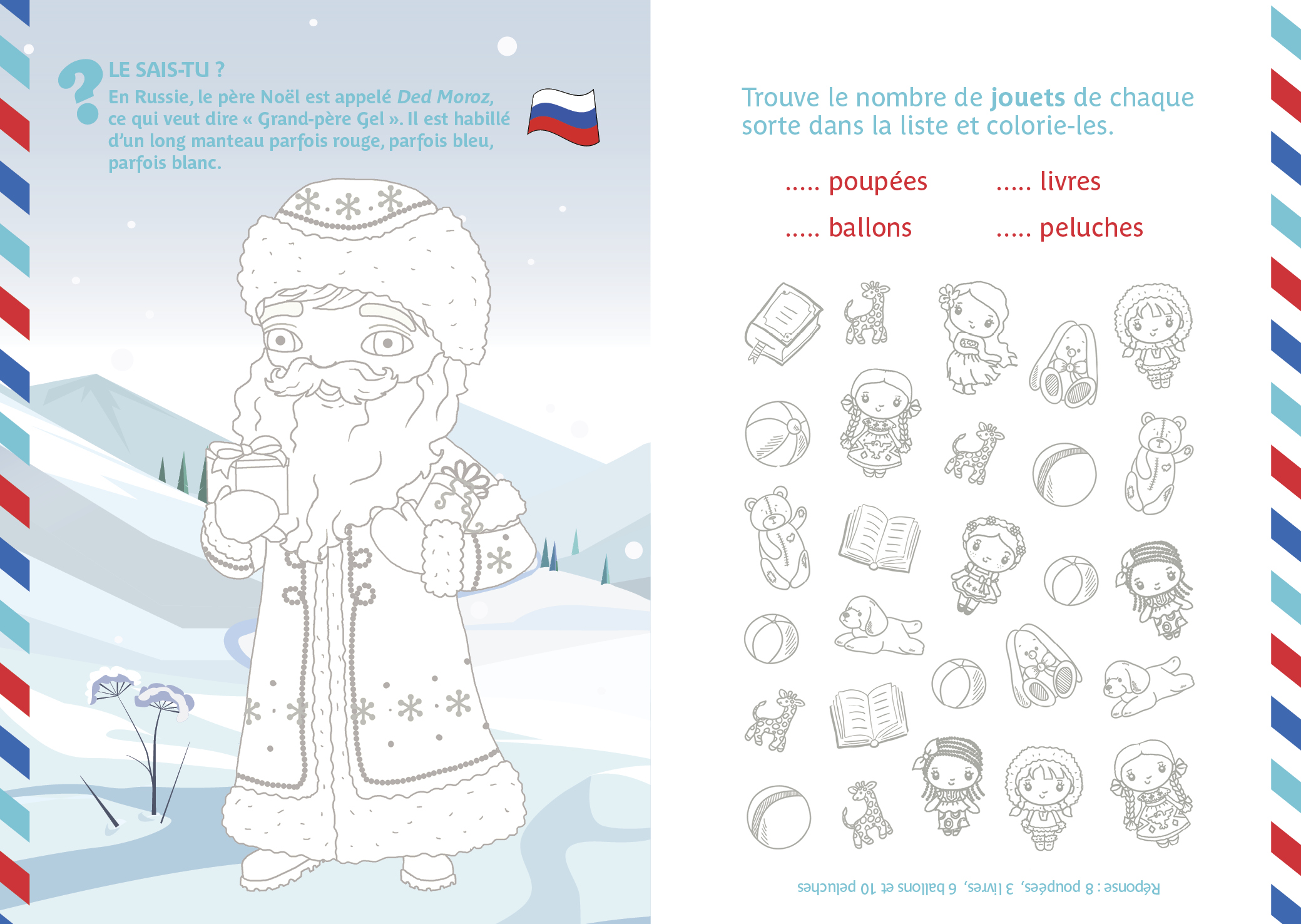Pour compléter l’activité, l’enfant découvre les célébrations de Noël dans le monde grâce à un livret-passeport contenant des informations documentaires, des jeux et des coloriages.