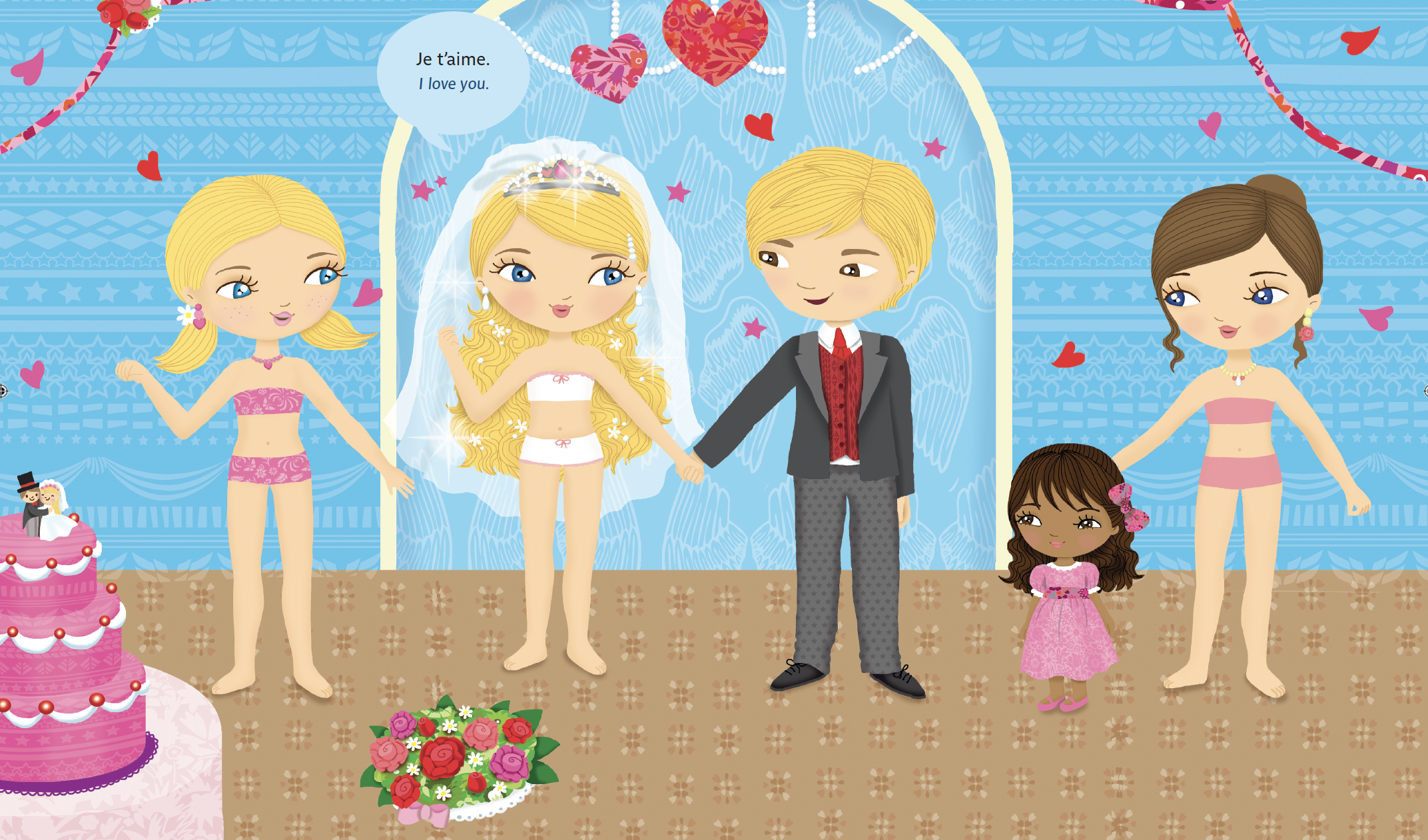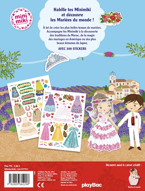 Avec 300 stickers et 12 scènes, l'enfant imagine et crée les plus belles tenues de mariage aux États-Unis, en Espagne, au Maroc, en France, au Groenland, au Japon, chez les Amérindiens et à Tahiti.