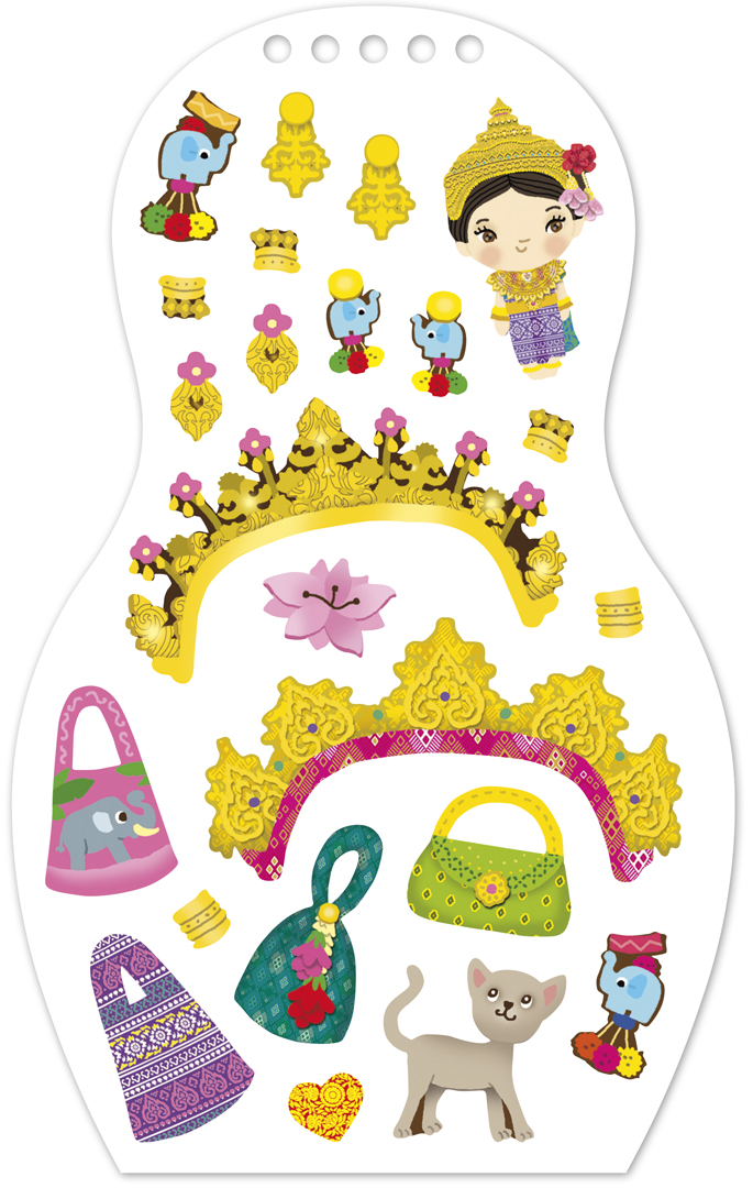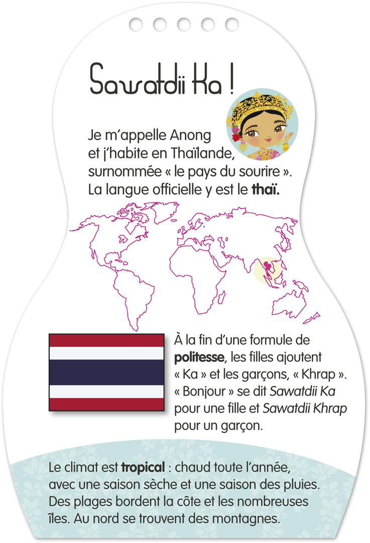Et en plus, des infos documentaires sur les traditions et les tenues en Thaïlande : les vêtements, l'alimentation, l'école, la danse, les animaux, les temples.