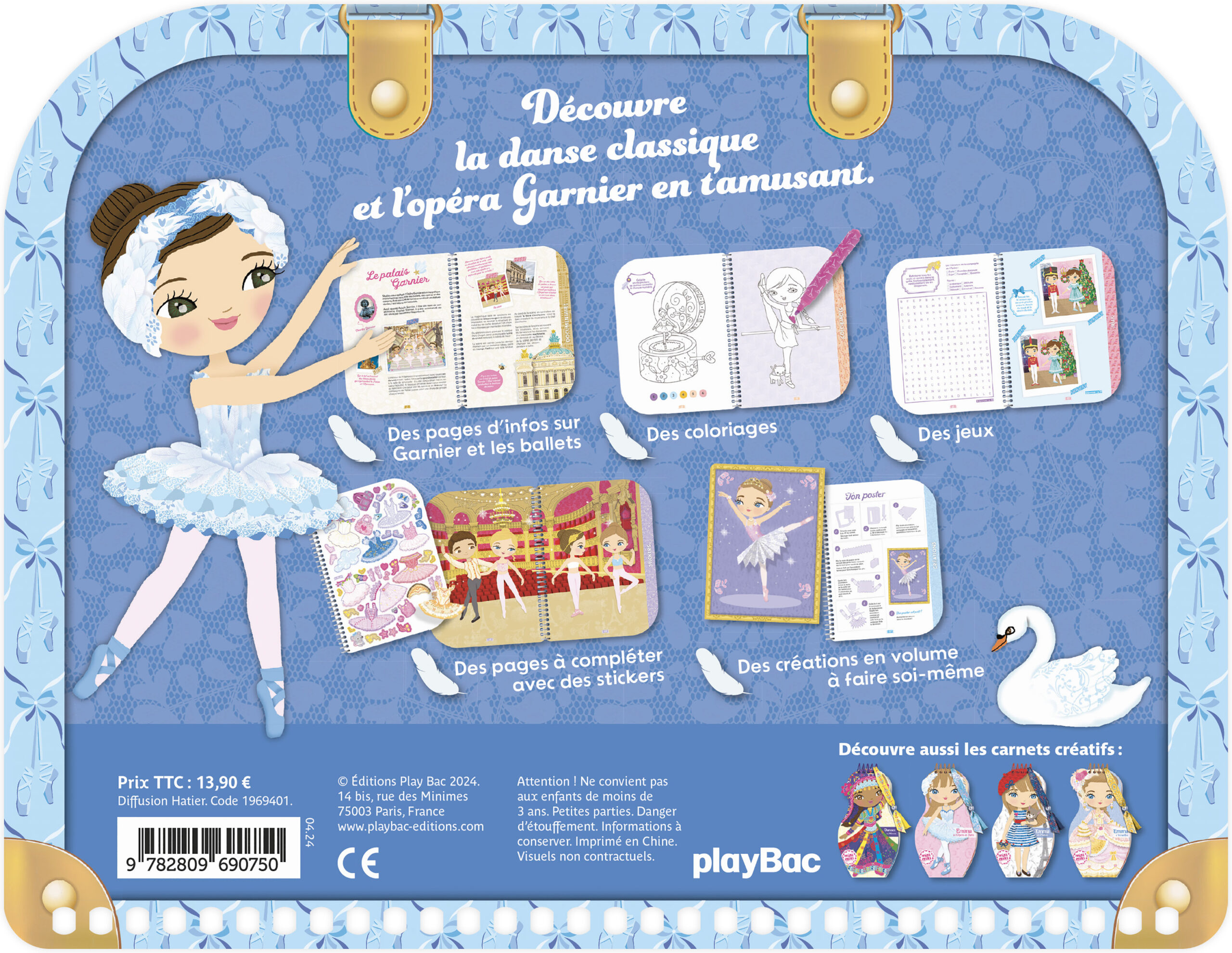 Un grand cahier d’activités en forme de valise, avec de jolies anses en tissu pour découvrir la danse classique et l’Opéra Garnier en s’amusant.