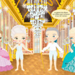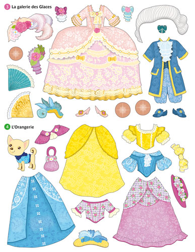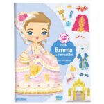 Direction Versailles avec Emma. Avec 300 stickers et 12 scènes, l'enfant imagine et crée les plus belles tenues pour se promener devant la grille royale, autour du bassin d'Apollon, dans la galerie des glaces, l'Orangerie, dans la chambre de la Reine et sa pièce des bains.