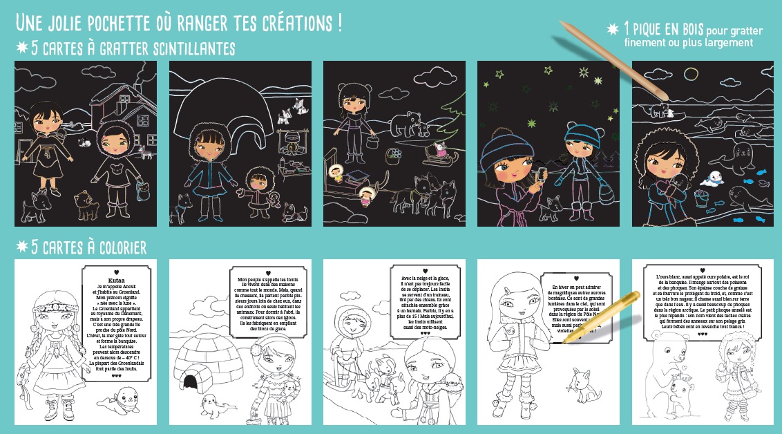 Gratte et dévoile les zones noires pour découvrir le Groenland avec Anouk ! Cette pochette contient : – 5 cartes à gratter avec de l’architecture (cabanes, igloo), les animaux de la banquise (phoques, ours, chiens), les tenues typiques, les aurores boréales et les traîneaux ; – 5 coloriages avec des informations documentaires ; – 1 pique en bois pour gratter finement ou plus largement.