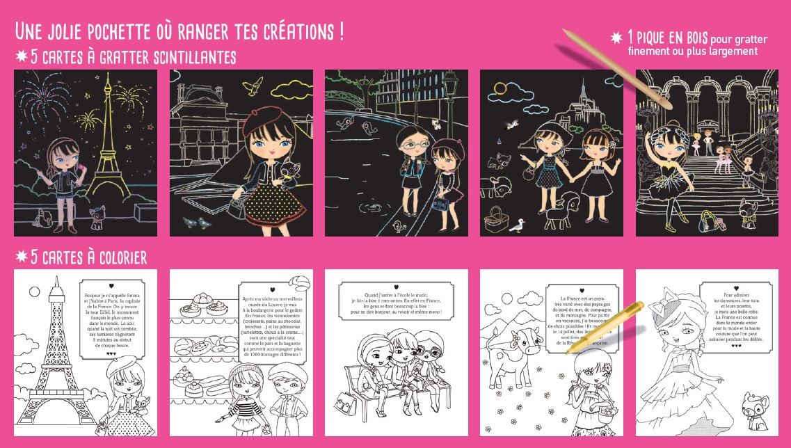 Gratte et dévoile les zones noires pour découvrir la France avec Emma ! Cette pochette contient : – 5 cartes à gratter avec de l’architecture (la tour Eiffel, le Mont-Saint-Michel), des éléments typiques (une boulangerie, le canal Saint-Martin), les robes de haute couture et bien sûr les danseuses de l’opéra de Paris ; – 5 coloriages avec des informations documentaires ; – 1 pique en bois pour gratter finement ou plus largement.
