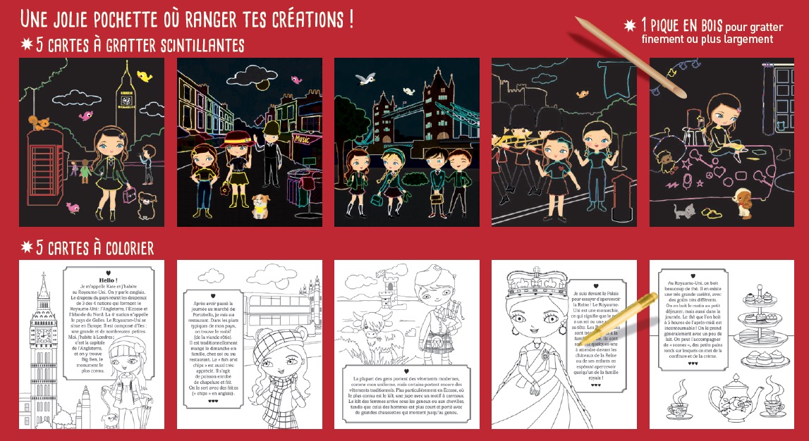 Gratte et dévoile les zones noires pour découvrir le Royaume-Uni avec Kate !  Cette pochette contient : – 5 cartes à gratter avec de l’architecture (Big Ben, le London Bridge), des éléments typiques (les bus à étage, les cabines téléphoniques, le tea time), les tenues typiques et bien sûr des éléments sur la famille royale ; – 5 coloriages avec des informations documentaires ; – 1 pique en bois pour gratter finement ou plus largement.
