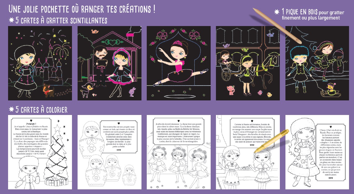 Gratte et dévoile les zones noires pour découvrir la Russie avec Léna ! Cette pochette contient : – 5 cartes à gratter avec de l’architecture (le Kremlin, le ballet du Bolchoï), les tenues typiques, les plats traditionnels et les matriochkas ; – 5 coloriages avec des informations documentaires ; – 1 pique en bois pour gratter finement ou plus largement.