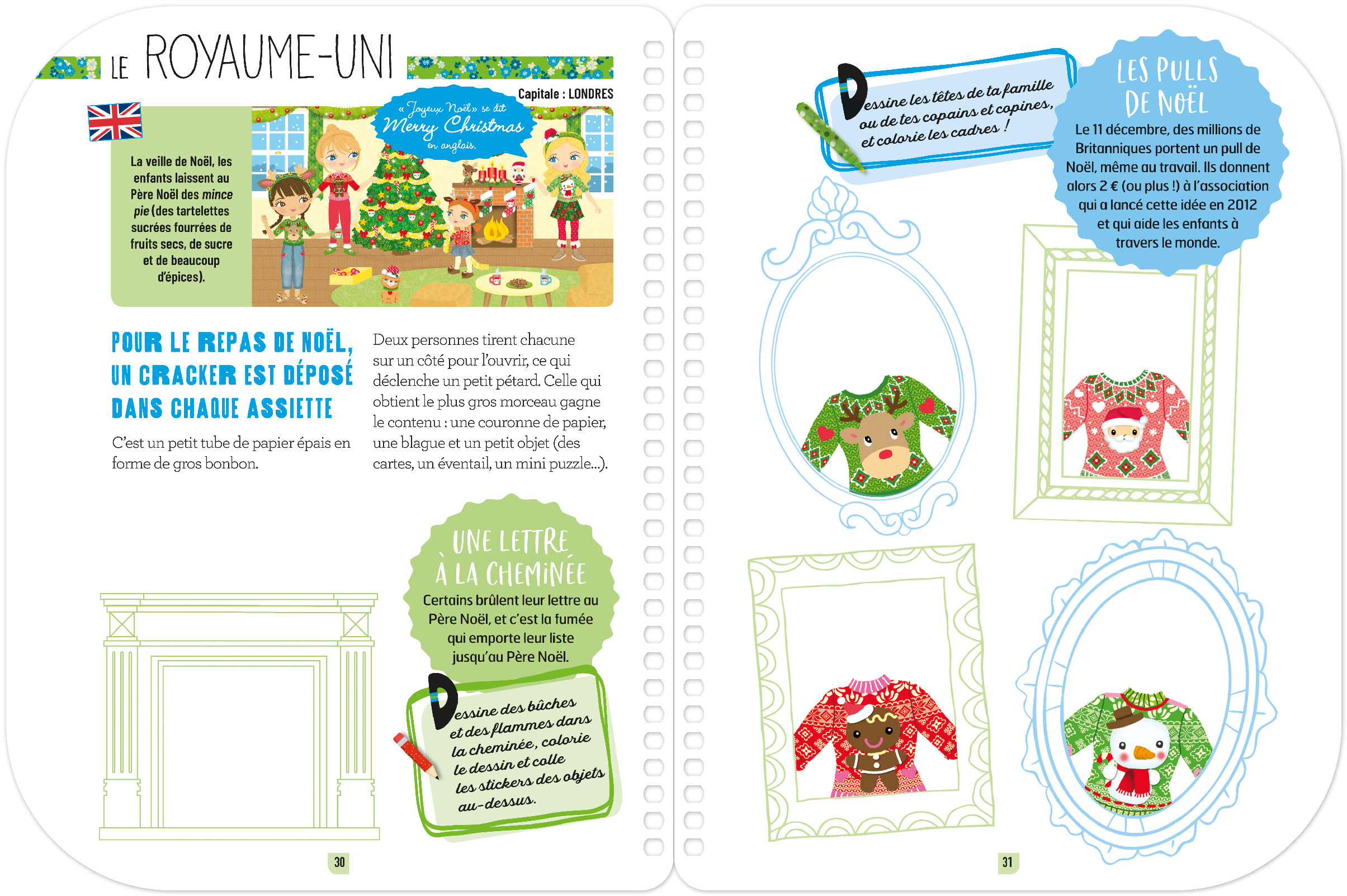 Des heures d’activités : des coloriages, des autocollants, des petits mots à découper pour dire "Joyeux Noël" dans toutes les langues, une jolie guirlande à créer, des jeux et des pages documentaires pour apprendre comment Noël se fête dans les autres pays du monde.