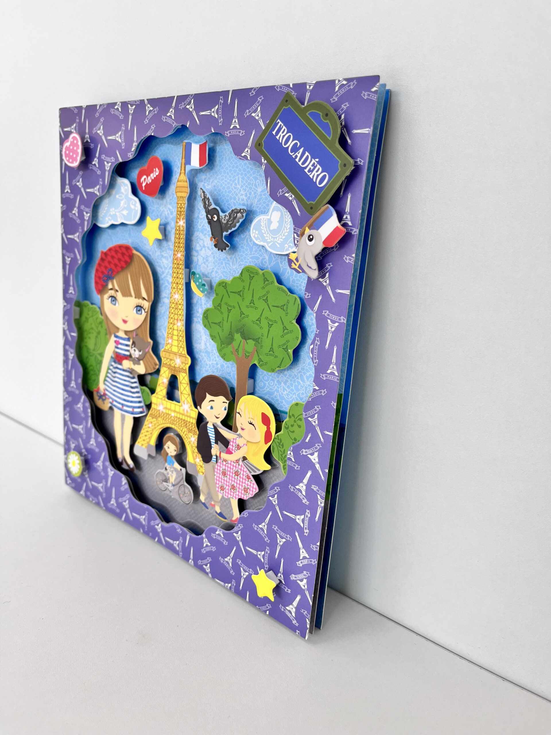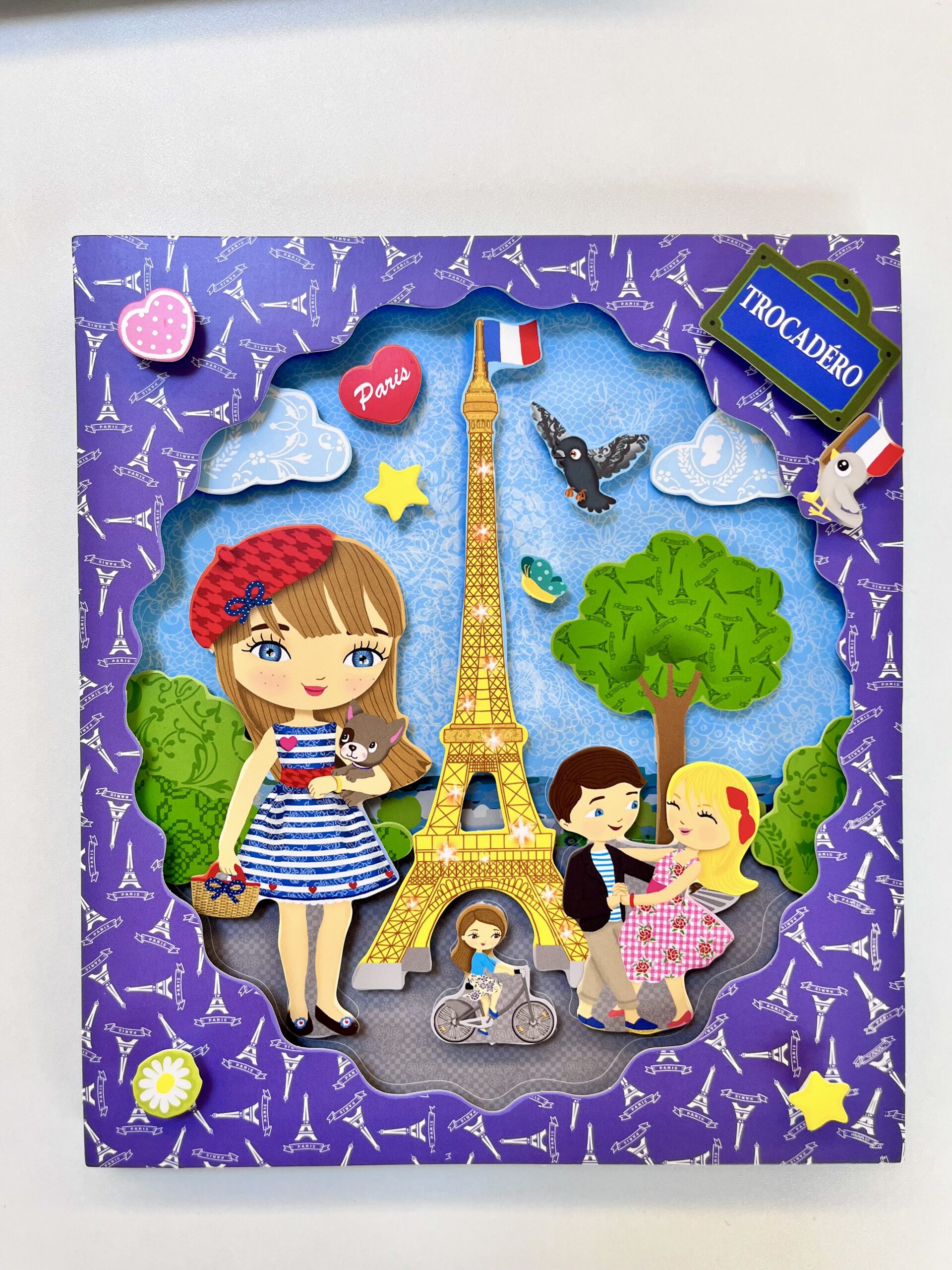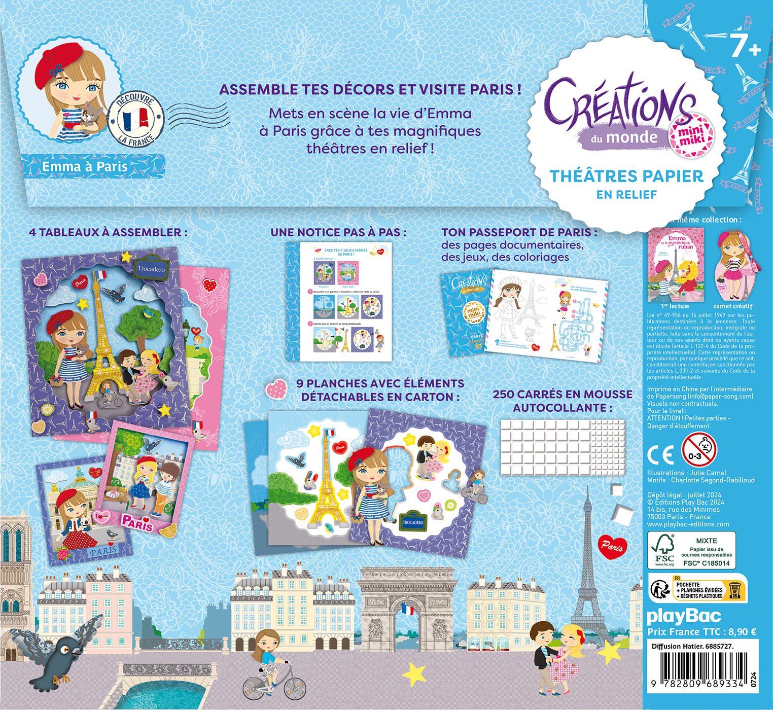 Avec cette pochette, l’enfant met en scène la vie d’Emma à Paris grâce à de magnifiques théâtres en relief ! 4 tableaux à créer en assemblant des éléments en carton pré-découpés avec de petits carrés de mousse autocollante.