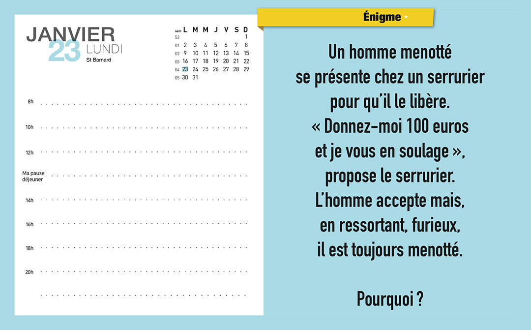 Pour trouver une librairie où acheter Mon calendrier éphéméride 2023 Casse-tête – L’Année à Bloc (de janv. à déc. 2023), on vous invite à visiter le site Place des libraires !Place des Libraires