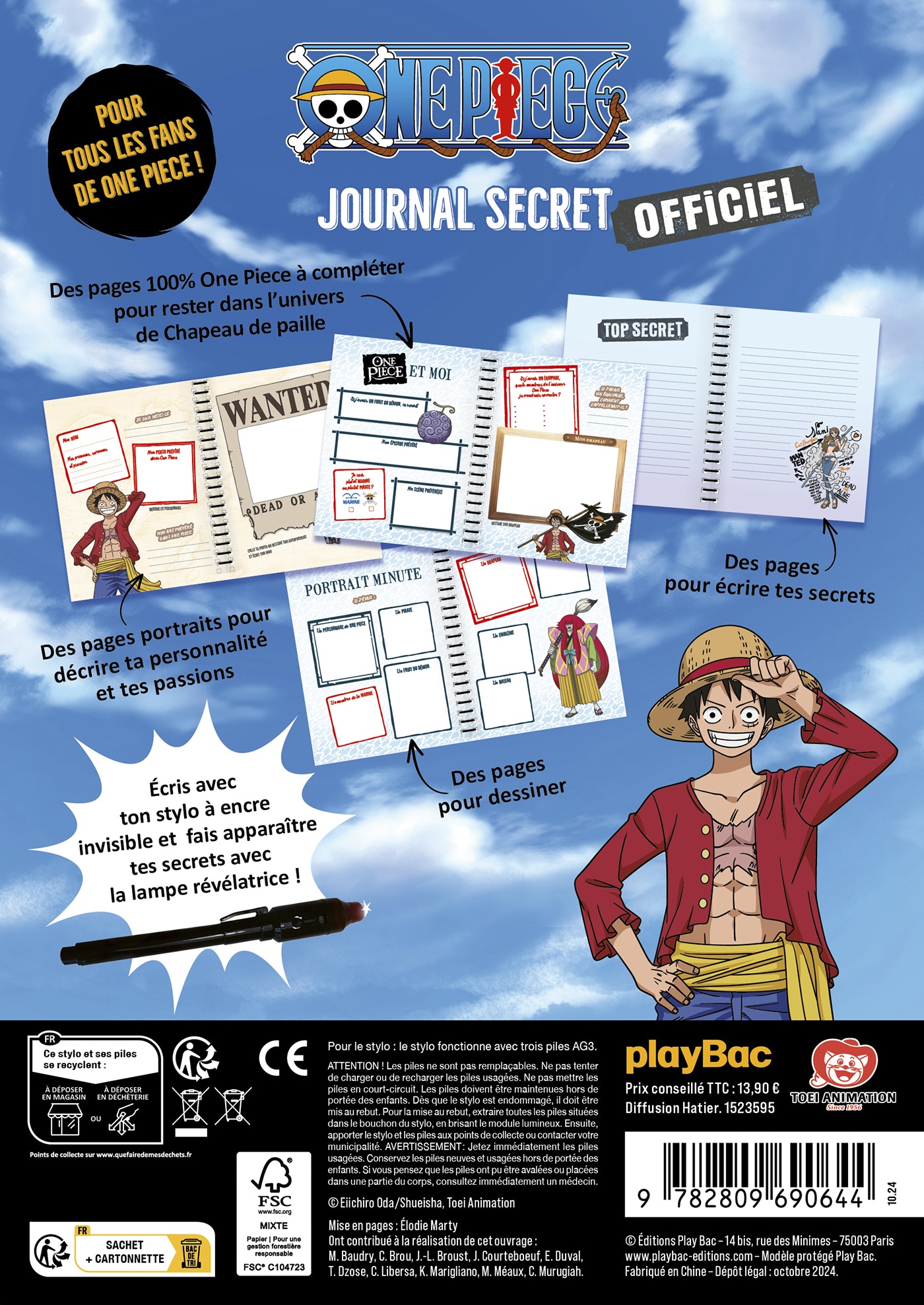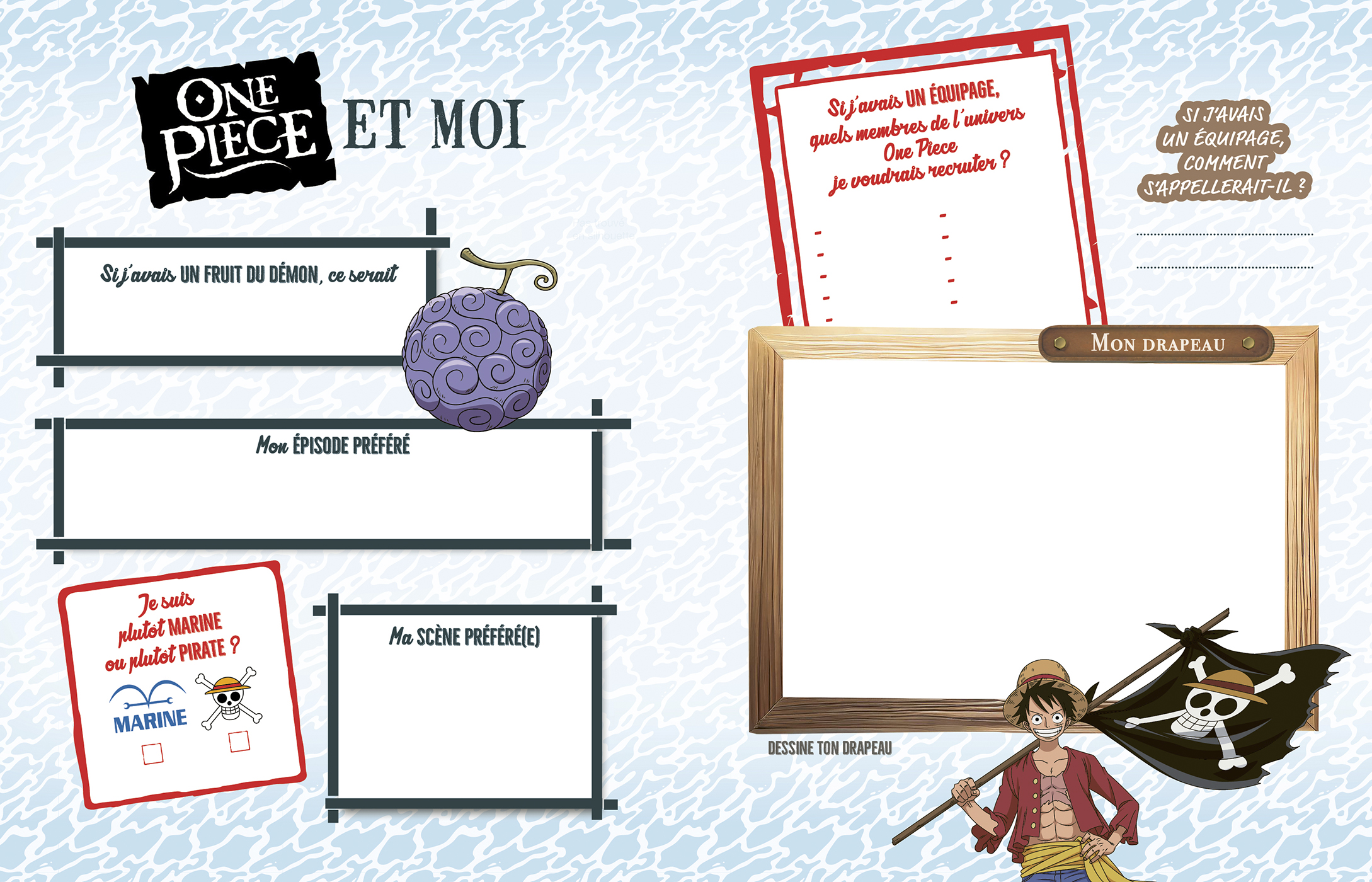 Des pages pour écrire tes secrets, des pages portraits pour décrire ta personnalité et tes passions, des espaces pour dessiner et des pages 100% One Piece à compléter pour rester dans l’univers et vivre sa passion à fond !