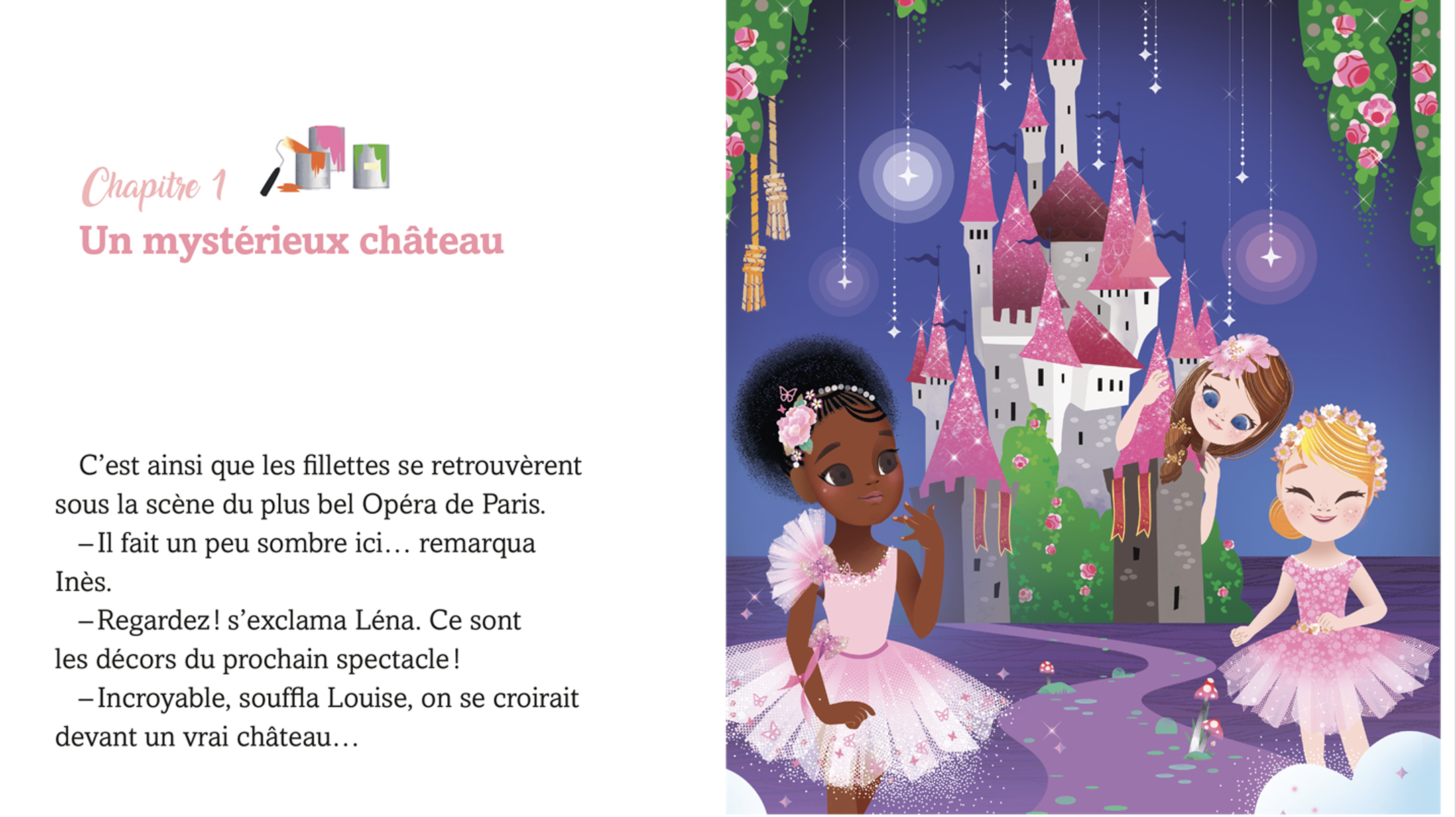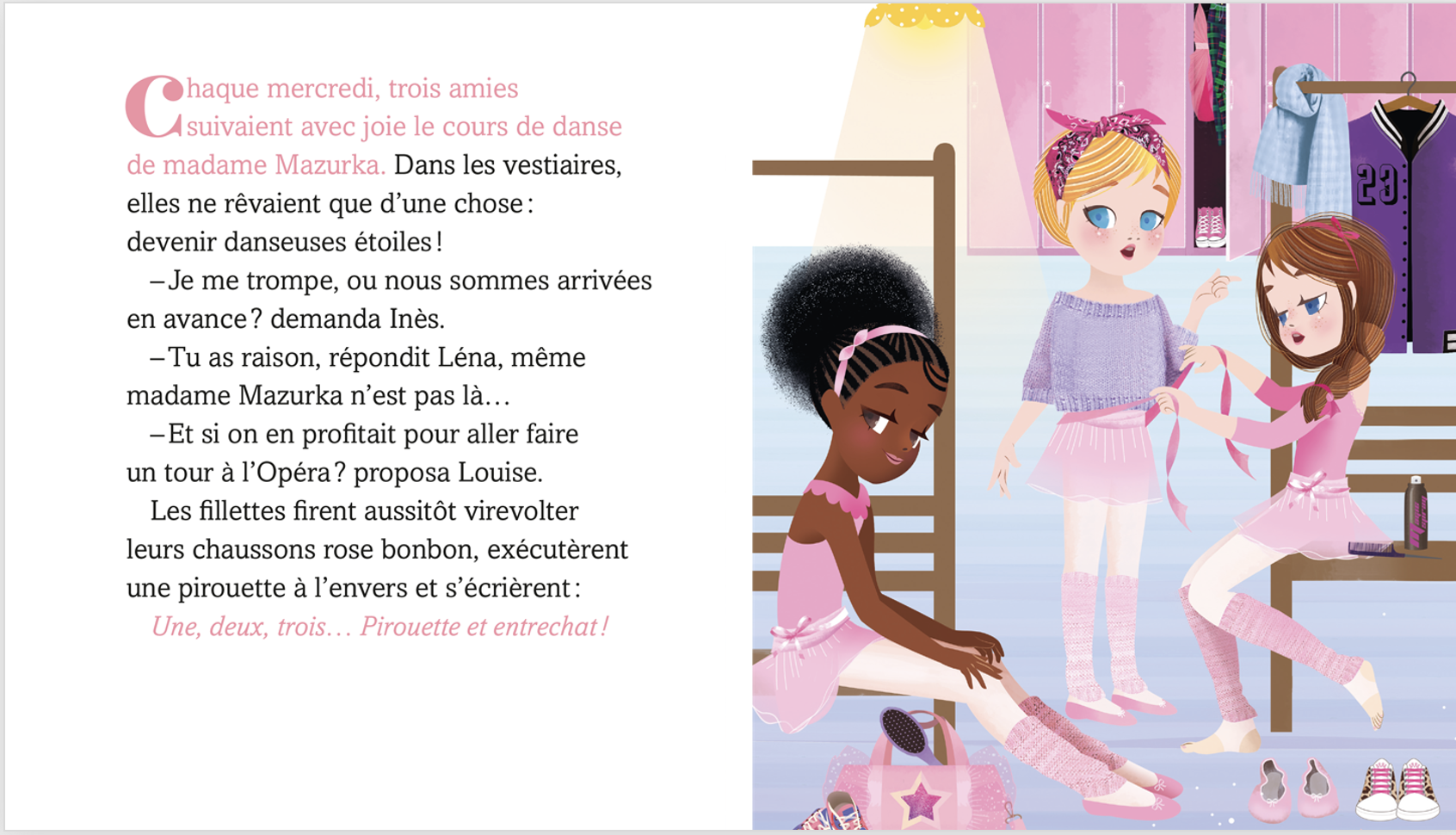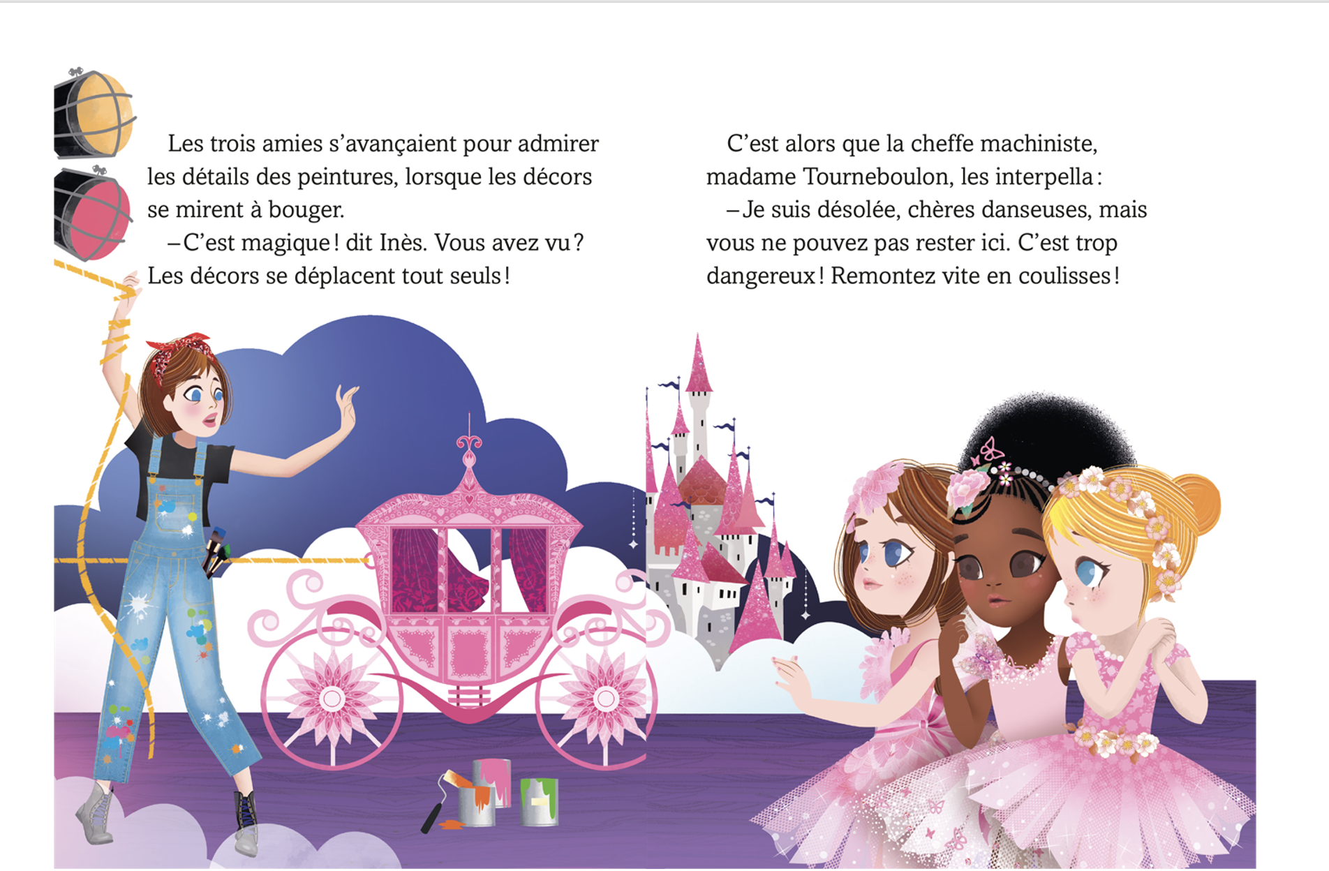 Ce mercredi-là, elles arrivent en avance au cours de madame Mazurka… Alors Une, deux, trois… Pirouette et entrechat ! elles partent faire un tour à l’Opéra ! Elle se retrouvent sous la scène, où la cheffe machiniste manipule les décors. Elles doivent partir, c’est trop dangereux, mais en sortant, elles entendent un grognement effrayant ! Y aurait-il une bête féroce à l’Opéra ?